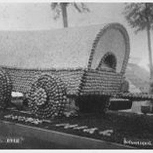 Photo--black and white postcard: Gravenstein Apple Show display of a covered wagon in August, 1912. The wagon is made of whole and sliced apples and is the display of the Vine Hill growers district. Other displays are in background. Photo is captioned: "Apple Show, 1912 Sebastopol, Calif."