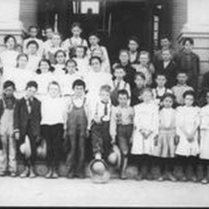 Photo--black and white: Class photo of 4th graders from the New Sebastopol Grammar School about 1906. The children are standing on the front steps of the school. The boys are dressed in overalls and most carry straw hats and the girls are in dresses