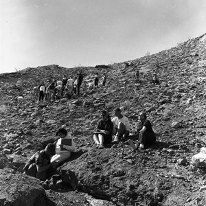 Negative shows students examining the terrain. Scanned with Epson Perfection V700 Photo as 1200 dpi TIFF image in 8 bit grayscale.