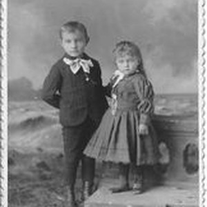 Photo--black and white, cabinet card: Ezra Jonas (b abt 1886) and his younger sister Rhoda L. Jonas (1887-1985) circa 1890. Eldest children of Noah & Bell Jonas). Photo by Piggott corner of 4th & B st, Opperating in Occidental Hotel, Santa Rosa, CA