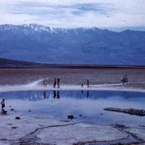 Slide shows a group of people standing on the salt flats around a pool at Badwater Basin. Badwater Basin is the lowest point in North America at 282 feet below sea level. Scanned with Epson Perfection V700 Photo as 3200 dpi TIFF image in 24 bit RGB color.