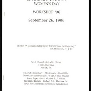 Women's day program, workshop, "A conditional remedy for spiritual delinquency", Texas southeast, COGIC, Austin, Texas, 1996 September 26. [Description English/roman)]