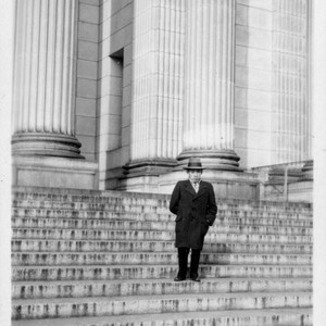 Y. C. Hong is pictured standing on the front steps of a building in Washington D. C. He is dressed in a dark suit, trench coat, and a hat. This picture was most likely taken at the time when Y. C. Hong and other Chinese American Citizens Alliance members traveled to Washington D. C. to testify before the House of Representatives on Chinese immigration matters. Hong family papers. The Huntington Library, San Marino, CA.