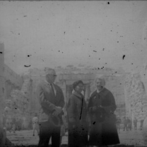 Alice Peters with unidentified man and woman standing in front of unidentified ruins