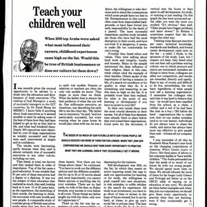 Charles Handy article on what makes executives successful, and the importance of investing in the training and education of young children. Handy begins the article discussing how he was given the opportunity to be an adviser to a study on successful Arab executives. According to Handy, the study revealed ten different factors that contribute to a person's success in the organization world, with education coming in at the top of the list. Next on this list came exposure to early role models, followed by the experience of early responsibility or the business school of life. The fourth quality listed, ethics and values, was followed by the fifth factor, a commitment to self-development. The sixth element is formal, professional training and technical knowledge, while the last aspect listed was a problem-solving organization culture. Handy goes on to conclude, as a final thought, that investing in the education of children for the future, for far longer and further beyond what is currently practiced, should be one of the main priorities of British society.