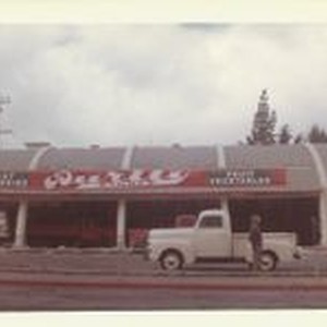 Photo--color: The Purity Market in the process of being torn down, about 1960. The Purity stood at the corner of McKinley and Main Streets in Sebastopol. The 'half barrel' design was typical of Puirity Stores in California in the 1940s.