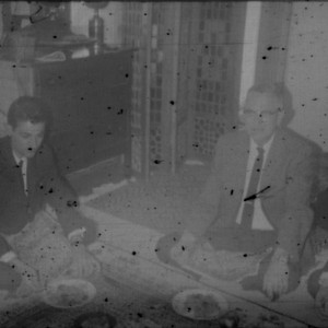 Image / Two unidentified men eating a meal on a carpet