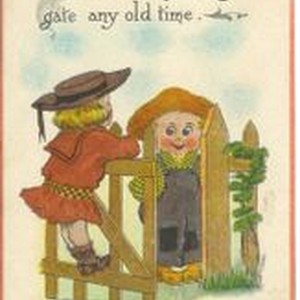 Postcard--color print: Greeting card--Picture of little girl in big hat swinging on gate and little boy watching. Postmarked September 12, 1913. Handwritten message on back from Lulu Nowlin to Mary Guisler.