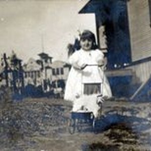 Photo, black and white: Alvina Amelia Smith Dohm Garceau (1910-1999)--with Sebastopol High School behind home in Sebastopol, CA: is the backyard of 482 Bonnardel house in about the year 1912 when this part of Sebastopol was Analy Township. My grandmother married Leon Dohm and then after he passed away in the 50's, she married again. She went by Alvina. This is the first Analy High School before the present one that is standing.