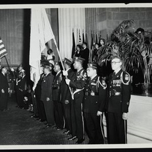 Photograph of a military color guard carrying flags, [s.d.]. "Fred Harris, photographer, 1829 Jackson Street, N.E., Hobard 2-1718". [Description English/roman)]