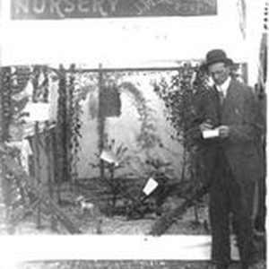 Photo--black and white: Gravenstein Apple Fair display of Co-Operative Nursery, J.M. Robinson, Proprietor on sign circa 1920. A man stands in front of the display with pad and pencil.