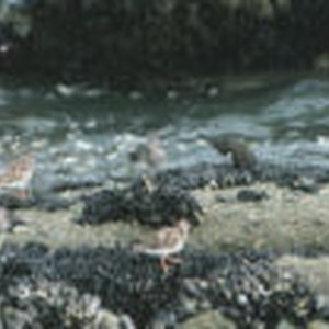 Two ruddy turnstones, a surfbird, and a black turnstone standing near a creek.