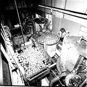 Photo--black and white: Unidentified apple processing plant with large equipment.