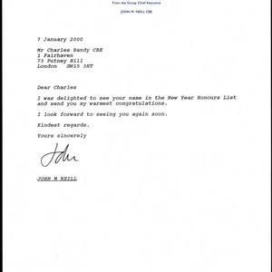 Letter from John M Neill to Charles Handy congratulating Handy on his name being included in the New Years Honours List, January 7, 2000; Charles Handy Papers; Box 13, Folder 11; 1 page
