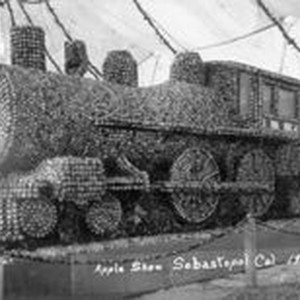 Photo--Black and white: 1914 Gravenstein Apple Fair display of a train.