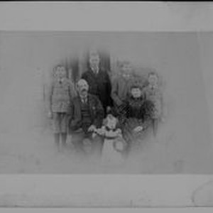 Photo--black and white: John Wesley Sullivan and wife Etta McReynolds Sullivan with their five children listed oldest to youngest--George, Francis, Perry, Ernest, Hiram Eugene. Photo taken by C. C. Curtis of San Jose, CA.