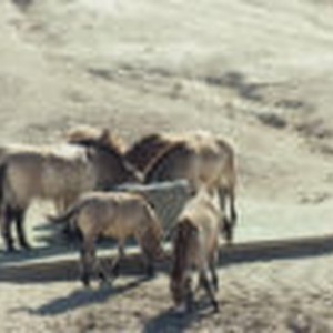 A group of horses gathering around a trough in the sand.