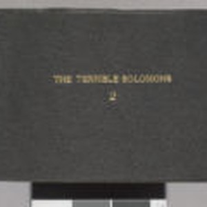 Bound in black textured material. The title, "The Terrible Solomons 2," is embossed in the center of the cover in gold lettering. The number "64" is affixed to the top of spine with glue. Images are of the landscapes and indigenous people of the Solomon Islands. Light wear on surface. Moderate wear at edges of spine and corners. Pages 78-100 are blank. Pages 78-100 are blank.