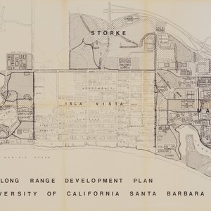 In this 1968 version of the long range development plan, the campus footprint expanded to include the Storke Campus area along El Colegio and Los Carneros Road, and the West Campus area around Coal Oil Point and the Devereux Slough.