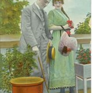 Postcard--color print: Greeting card--Picture of man and woman. Handwritten note on back. Postmarked Fresno County, CA Oct 6, 1913.
