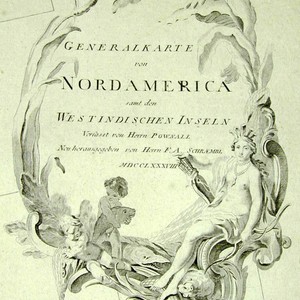 Map in two sheets. Kashnor notes, "A rare issue of this map. Pownall based his work upon the maps of Lewis Evans, and this map contains valuable geographic knowledge of the Ohio and Illinois territory." Submap: Specialkarte von der Baffin und Hudsons Bai. Prime meridian: Ferro. Relief: pictorial. Projection: Pseudocylindrical. Watermark: Fleur-de-lis lettering. Printing Process: Copper engraving. Verso Text: MS notes: No. 102 210; No. 101.