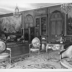 A view of the library facing the north wall, showing furniture and tapestries from the 18th century. In the back left is a writing desk and filing cabinet (bureau plat et cartonnier), attributed to Etienne Doirat, are from 1720 to 1732. The settee and chairs belong to the set of two settees and ten chairs whose upholstery covers were woven at Gobelins Manufactory, Paris, probably under the supervision of Jacques Neilson (1714-1788), after design by François Boucher (1703-1770) and Jean-Baptiste Oudry (1733-1755). The covers were woven circa 1779, and the frames are nineteenth century. The screen in the background is a six-panel folding screen (paravent) made at the Savonnerie Manufactory, Chaillot workshop, Paris, after designs by Alexandre-François Desportes (1661-1743), made between 1719 and 1784; the frame is of a later date. On the right is a writing desk (bureau plat), attributed to the Pagoda Master, made circa 1730. On this desk is a sculpture, Diane chasseresse (Diana the Huntress), made by Jean-Antoine Houdon in 1782. Hanging on a wall on the left is a Beauvais tapestry, "La Pipée aux Oiseaux (The Bird Catchers)." MS note on verso reads "HEH residence as art gallery: large library room." Stamp on verso reads "This print is released as a personal courtesy and is not for publication. All syndicate and publication rights reserved. Eyre Powell Press Service."