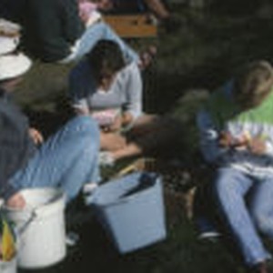 Students working with shellfish atop a rock on the seashore.