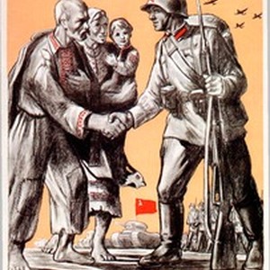 A poster dedicated to the events of September of 1939, in particular, to annexation of Western Ukraine and Western Belarus to the Soviet Union. Caption reads, "Podat' ruku pomoshchi bratskim narodam Zapadnoi Ukrainy i Zapadnoi Belorussii -- nasha sviashchennaia obiazannost'! / Подать руку помощи братским народам Западной Украины и Западной Белоруссии -- наша священная обязанность!", meaning, "To give a hand to brotherly people of Western Ukraine and Western Belarus is our sacred duty!". [Description English/roman)]