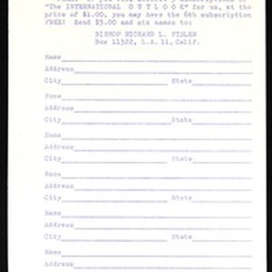 The international outlook magazine subscription solicitation, early 1960s. [Description English/roman)]