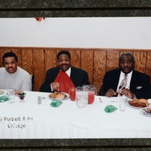 Mounted photograph of 3 unidentified men eating lunch, Chicago, Illinois, [s.d.]. From Corby Bush? [Description English/roman)]