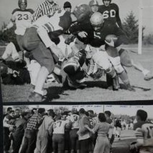 Photo--black and white: Analy High School Tigers football 1948. Two photos of Analy vs Tamalpais 1948. Bottom photo "end of the game 1948 Analy 7 Tam 6."