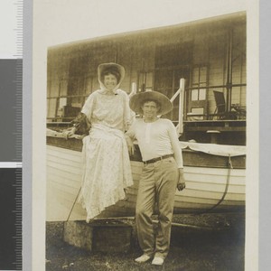 Jack London stands and Charmian London sits on edge of lifeboat which is on land set on blocks. Title transcribed from envelope. Date taken from biographical sources. Duplicate of JLP 151 which identifies this as taken in the Solomon Islands.