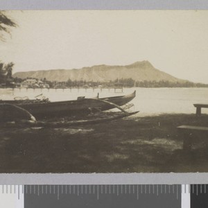 An outrigger canoe sits in the shade on shoreline with Diamond Head in the distance.