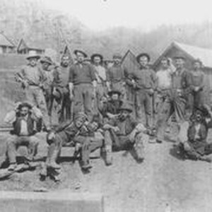 Photo--black and white: Photo: black and white: Identified by Ralph S. Sturgeon as "logging 50." After 1900--Woods crew or sawmill crew, Jenner, CA. Crew of men are standing and seated in front of rail tracks and cabins or houses in background. The men in the photo are numbered, but only the following are identified: 12: Sam Squibb--boss woods, also built railroad out to loading chute also tram. 13: Pete Alpine. 15: Auther (Arther?) Johnson. 18: Sam Squibb?? or #12 Boss in woods. Built railroad to point where ships were loaded and railroad up into Russian Gulch area where Jenner Mill had timber & was hauled out by steam locomotive. Helped build Jenner sawmill. Far right--man sitting holding hat, smoking pipe. Joe Bayoki. He worked with Jim Holmes- both millrights.