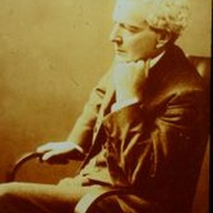 Slide--black and white photo: Luther Burbank portrait. Burbank is seated in a chair in left profile.