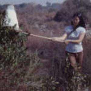 Student netting insects near shrubs.