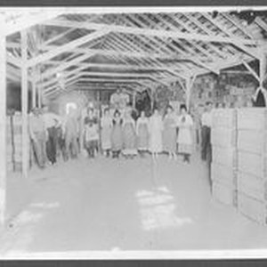 Photo--black and white, matted on brown posterboard: A group of men and women workers inside an apple packinghouse circa 1920's. Wooden boxes of apples are stacked all around. The boxes to the right foreground are labels "Bon Ton apples." Possibly Garcia & Maggini packinghouse--Bon Ton was G& M label.