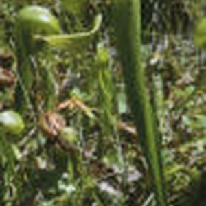 Close up of California pitcherplants growing amongst tall grass and assorted foliage.
