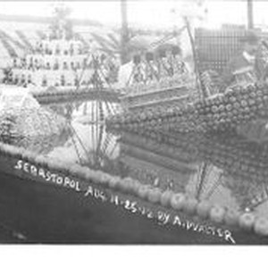 Postcard, black and white: A 1912 Gravenstein Apple Show exhibit of the sinking Titanic and an iceberg made of whole and dried sliced apples in a square pool of water. On the iceberg is the name W. S. Liddle who was an Englishman that bicycled around the world and later settled in Sebastopol. Postcard photo by A. Walter.