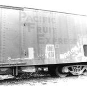 Photo--black and white: P&SR (Petaluma and Santa Rosa) railroad box car put in place behind the Sebastopol P&SR railroad depot that has become the West County Museum run by the Western Sonoma County Historical Society .