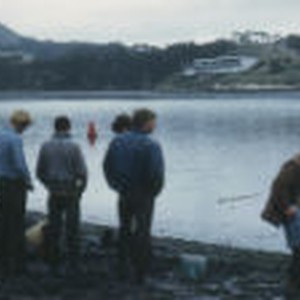 One student digs for clams in the mud while his fellow students look on.