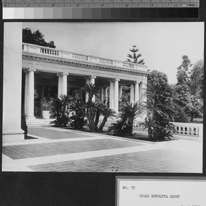 View of a group of cycas revoluta specimens (native to Japan) on the south terrace, with the loggia in the background. The label that accompanies this photo in the album reads "No. 73 Cycas Revoluta Group about 1915."