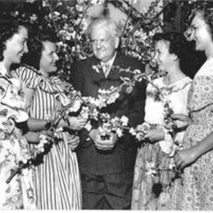 Former San Francisco Mayor Robert Lapman is surrounded by several Analy High School girls who are presenting him with spray of early Gravenstein apple blossoms in preparation for Sebastopol's first celebration of "Apple Blossom Time" in 1947