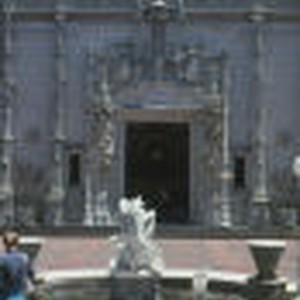 A statue sits in a lily pond in front of the main facade and entrance to the Hearst Castle