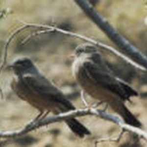 Two immature Say's phoebes perched on a tree branch.