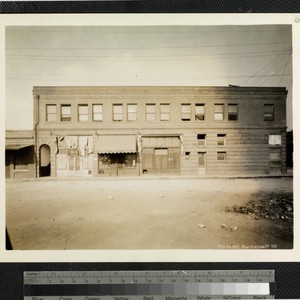 View of attached two-story brick buildings on Marchessault Street in Old Chinatown, Los Angeles. The end building is a Johnson & Musser Seed Co. store and one storefront reads Kim Lung. Title transcribed from photograph.