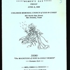 Women's day program, "The magnitude of hope in Godly women", Ministers and workers meeting, Texas southwest, Childress Memorial Church of God in Christ, San Antonio, Texas, 1988 April 8. [Description English/roman)]