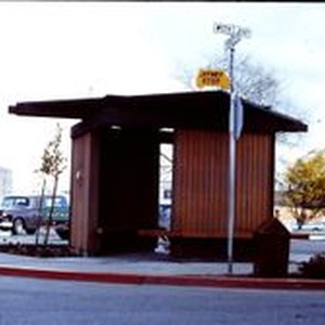 Slide, color transparency: Jitney Stop at Weeks Way and McKinley Street in Sebastopol, 1977.