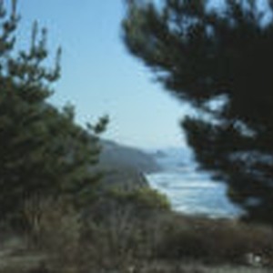 Pine trees dominate the foreground as the rugged coast at Big Sur is seen from the Kirk Creek Campground.
