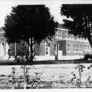 Photo--postcard black and white: Analy Union High School gymnasium, Sebastopol, California. Postcard numbered "5243." Background: Analy's original gyn was a wooden structure and was replaced in 1927 by this brick building. W. H. Weeks was the architect credited with the design. This gym was in use until the 1970s when it was demolished to make room for the school's Willard Libby Library.